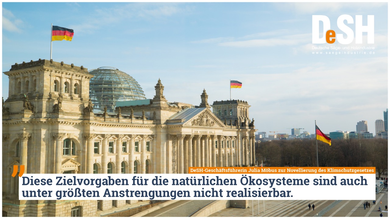 Für den Sektor, der auch die Forstwirtschaft und die Holzprodukte umfasst, wird nun angestrebt, bis zum Jahr 2030 in Summe 45 Millionen Tonnen Treibhausgase zu kompensieren. „Diese Zielvorgaben für die natürlichen Ökosysteme sind auch unter größten Anstrengungen nicht realisierbar. Dies hat auch der Bundesrat in seiner Stellungnahme vom 28. Mai mit Nachdruck verdeutlicht. Die kurzfristige Senkenwirkung des Waldes lässt sich nicht ohne großflächige Nutzungsverbote erreichen. Eine dauerhafte, nachhaltige CO2-Reduktion ist jedoch nur durch nachhaltige Waldbewirtschaftung und Holzverwendung möglich“, sagt Julia Möbus, Geschäftsführerin des DeSH.