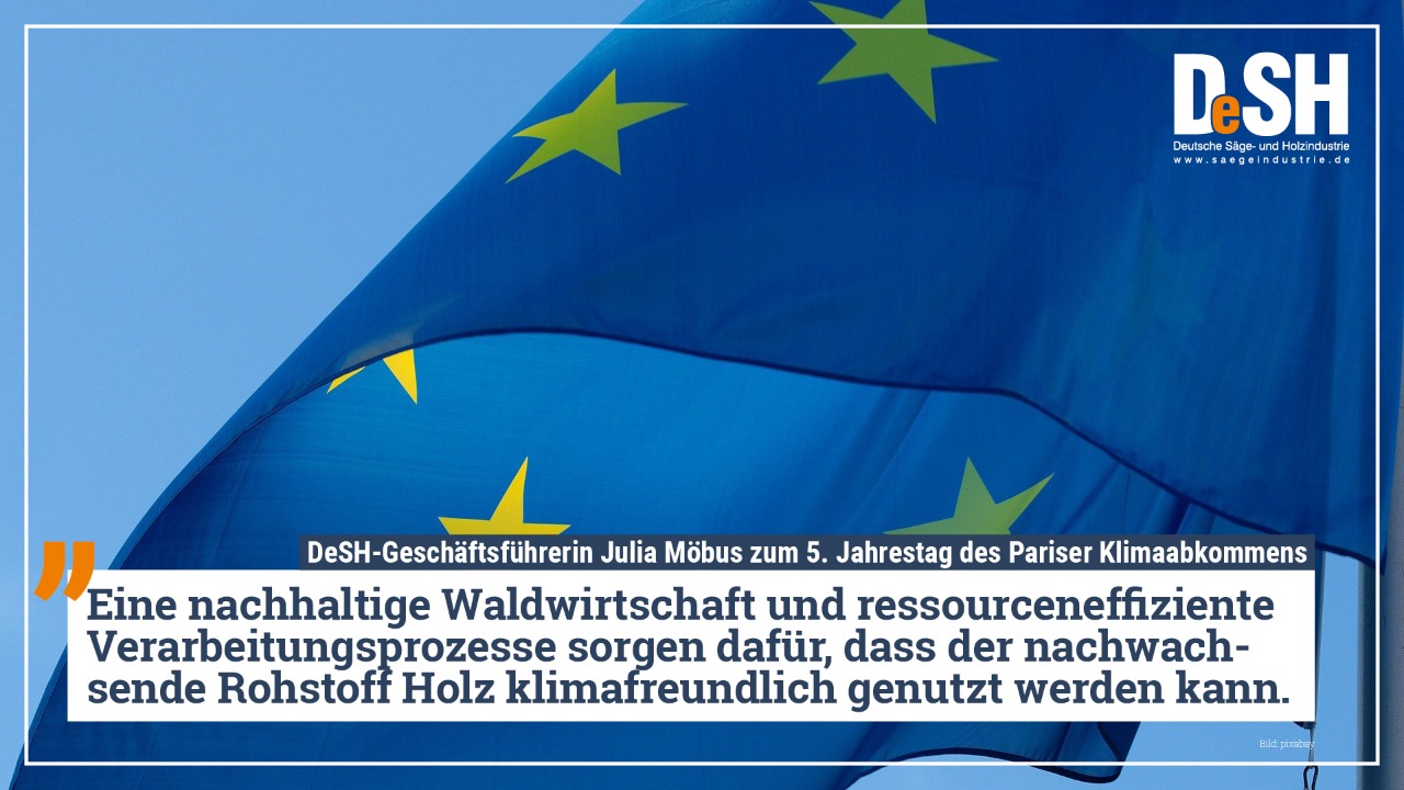 „Bereits vor dem Übereinkommen von Paris konnten Forst und Holz in Deutschland als Vorbild einer klimafreundlichen Wirtschaft gelten. Eine nachhaltige Waldwirtschaft und ressourceneffiziente Verarbeitungsprozesse sorgen dafür, dass der nachwachsende Rohstoff Holz klimafreundlich genutzt werden kann,“ erklärt Julia Möbus Geschäftsführerin des DeSH, anlässlich des Jahrestags des Übereinkommens. „Unsere Wälder werden bereits seit 300 Jahren nachhaltig bewirtschaftet. Das gewachsene Holz speichert CO2 und ersetzt nicht nur als Rohstoff energieintensive Materialien, sondern auch als Energieträger fossile Brennstoffe. Holzverwendung trägt heute aktiv zur Einhaltung des 1,5-Grad-Ziels bei,“ erläutert Möbus weiter.