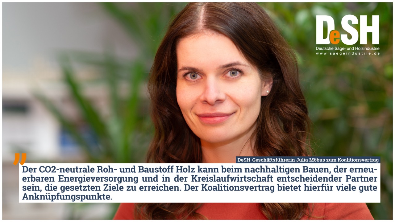 Auch der Wald spielt im vorgestellten Vertrag eine wichtige Rolle: „Dass die Waldbewirtschaftung im Vertrag verankert wurde, ist für uns zentral wichtig und unerlässliche Grundlage der Holzverwendung. Auch die Förderung des Waldumbaus hin zu klimastabilen Wäldern begrüßen wir“, sagt DeSH-Hauptgeschäftsführer Lars Schmidt. Unverständlich für den DeSH ist jedoch der angekündigte Einschlagsstopp für alte Buchenwälder: „Das ist ein falsches Signal für die gewünschte Stärkung der Laubholzverwendung in Deutschland. Denn die wird durch den Mischwald in Zukunft notwendig, ist jedoch bereits heute durch eine unsichere Rohstoffgrundlage gekennzeichnet“, so Schmidt.