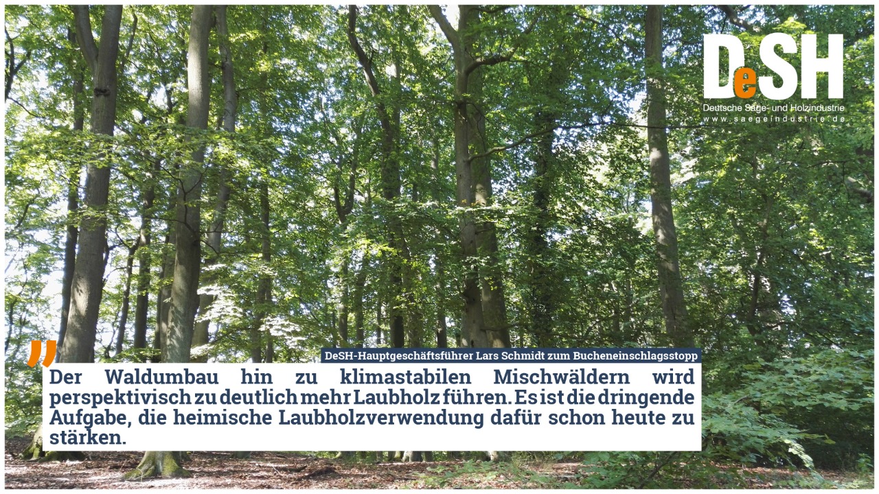 Es sind elf Wörter mit einer großen Signalwirkung: In dem von den Ampel-Partnern vorgestellten Koalitionsvertrag ist vorgesehen, den Einschlag von Buchen in alten, naturnahen Wäldern im öffentlichen Besitz zu stoppen. Für die Verbände der Säge- und Holzindustrie sowie der Möbelindustrie ein Schritt in die falsche Richtung „Der Waldumbau hin zu klimastabilen Mischwäldern wird perspektivisch zu deutlich mehr Laubholz führen. Unser gemeinsames Ziel ist, diese Hölzer in langlebige Produkte und Anwendungen zu bringen, um damit zu einem effektiven Klimaschutz beizutragen. Es ist die dringende Aufgabe, die heimische Laubholzverwendung dafür schon heute zu stärken. Denn für Investitionen und Innovationen in die Zukunft brauchen die Unternehmen verlässliche Rahmenbedingungen“, kommentiert DeSH-Hauptgeschäftsführer Lars Schmidt den Einschlagsstopp.