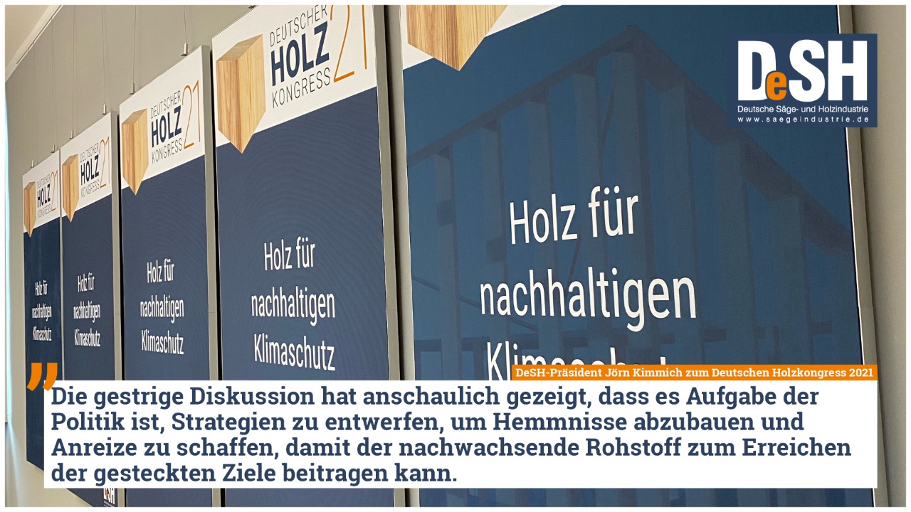 Jörn Kimmich, Präsident des DeSH, freut sich über den gelungenen Kongressauftakt: „Holz spielt für das Ziel eines klimaneutralen Deutschlands bis 2045 eine überaus wichtige Rolle. Die gestrige Diskussion hat anschaulich gezeigt, dass es Aufgabe der Politik ist, Strategien zu entwerfen, um Hemmnisse abzubauen und Anreize zu schaffen, damit der nachwachsende Rohstoff zum Erreichen der gesteckten Ziele beitragen kann. Über die unterschiedlichen Konzepte und Ideen der Parteien konnten sich die Teilnehmer gestern einen Überblick verschaffen.“