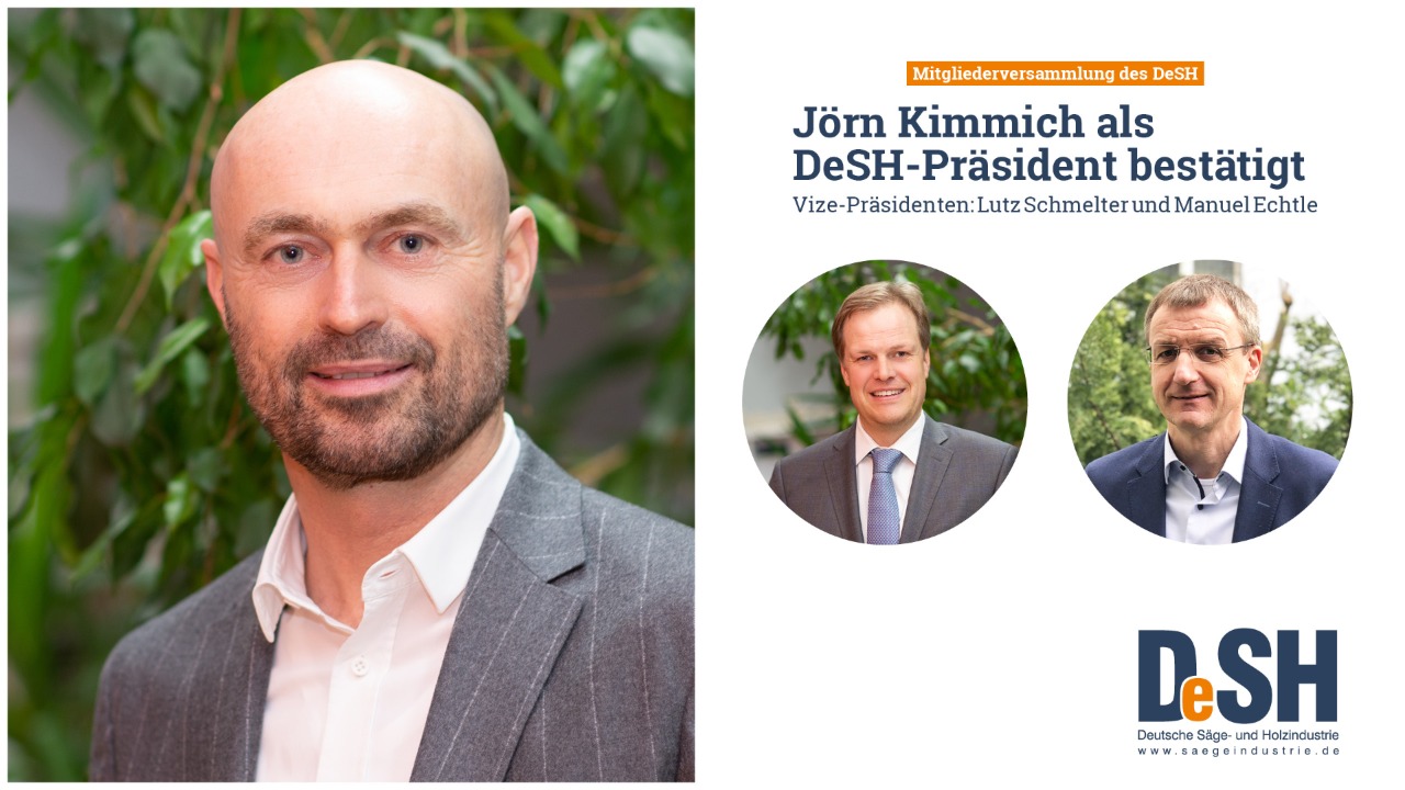 Auf der diesjährigen Online-Mitgliederversammlung hat der Deutsche Säge- und Holzindustrie Bundesverband (DeSH) seinen Präsidenten Jörn Kimmich für weitere zwei Jahre im Amt bestätigt. Ebenfalls wiedergewählt wurde Vizepräsident Lutz Schmelter, neu im Vorstand wird Manuel Echtle als Vizepräsident vertreten sein.