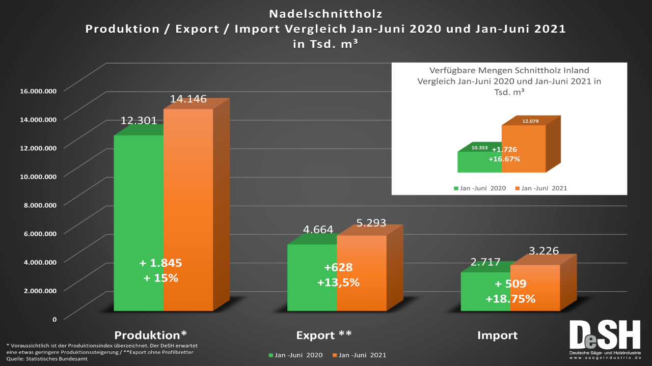 Unter Einbeziehung des Imports von 3,2 Mio. m³ Nadelschnittholz stand dem deutschen Markt dank der anhaltenden Bemühungen der Säge- und Holzindustrie im ersten Halbjahr 2021 eine Rekordmenge von über 12 Mio. m³ Nadelschnittholz zur Verfügung – ein Zuwachs von mehr als 1,7 Mio. m³ (16,7 Prozent) im Vergleich zum Vorjahr.