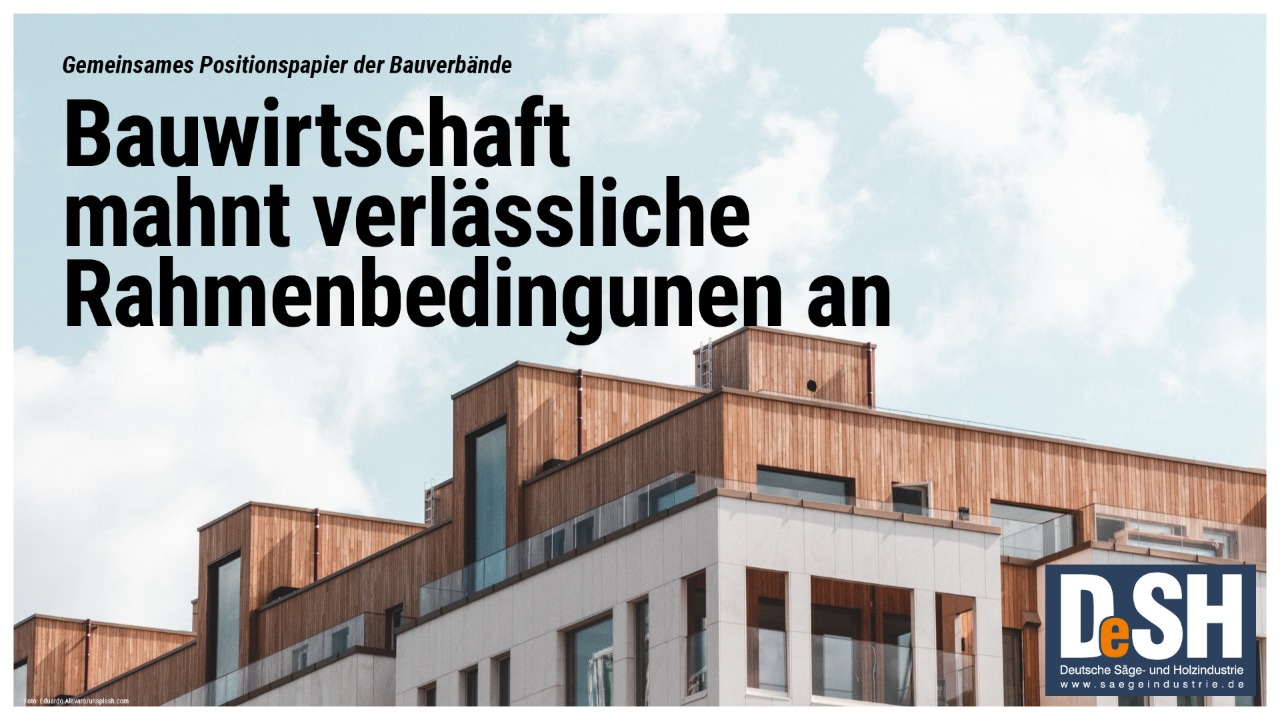 Ein breites Bündnis verschiedener Verbände aus der Bauwirtschaft, darunter auch der Deutsche Säge- und Holzindustrie Bundesverband e.V. (DeSH), haben in einem gemeinsamen Positionspapier eine Reihe von Maßnahmen vorgeschlagen, mit denen die Schaffung von mehr Wohnraum durch ressourceneffizientes Bauen und Modernisieren schnell und klimafreundlich verwirklicht werden kann. Der DeSH betont dabei die Notwendigkeit verlässlicher Rahmenbedingungen für das klimaschonende Bauen der Zukunft und die Rolle von Holz, als vielseitigen und nachhaltigen Baustoff.