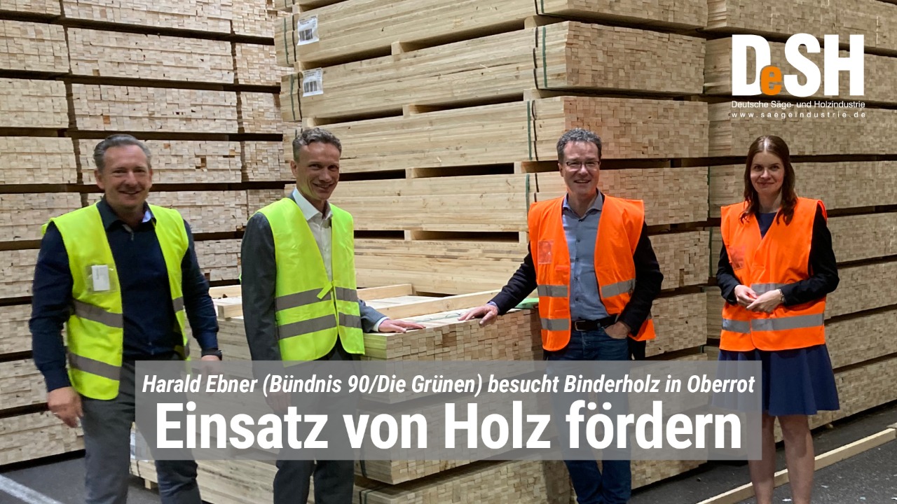 Am 24. Mai besuchte Harald Ebner, Abgeordneter im Deutschen Bundestag für Bündnis 90/Die Grünen und Vorsitzender des Ausschusses für Umwelt, Naturschutz, nukleare Sicherheit und Verbraucherschutz die Binderholz Oberrot/Baruth GmbH am Standort Oberrot. Bei einem Rundgang durch das Unternehmen der Säge- und Holzindustrie in seinem Wahlkreis machte sich der Politiker ein Bild von der nachhaltigen und effizienten Verarbeitung des regionalen und nachwachsenden Rohstoffs Holz. Dabei tauschte er sich mit Geschäftsführer Markus Kehren und Julia Möbus, der Geschäftsführerin des Deutsche Säge- und Holzindustrie Bundesverbands e.V. (DeSH), über die Chancen und Herausforderungen der Holzverwendung für Wirtschaft, Gesellschaft und Klimaschutz aus.