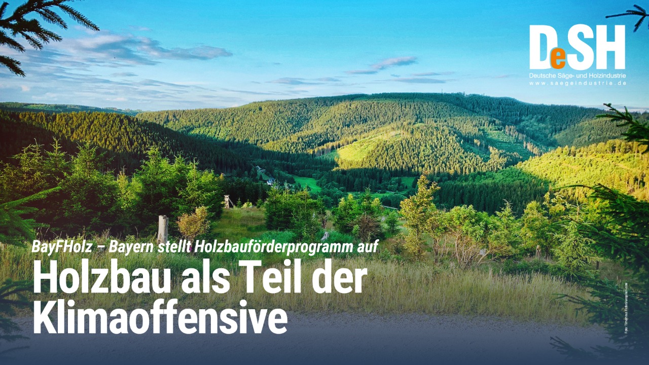 Mit dem Ziel bis 2040 klimaneutral zu werden, hat die bayerische Landesregierung den Holzbau zu einem wichtigen Bestandteil ihrer Klimaoffensive „Klimaland Bayern“ erklärt. Das heute gemeinsam von Forstwirtschaftsministerin Michaela Kaniber und Bauminister Christian Bernreiter vorgestellte Bayerische Holzbauförderprogramm (BayFHolz) stärkt nun den Einsatz des nachwachsenden Rohstoffs im Bauwesen. Der Deutsche Säge- und Holzindustrie Bundesverband e.V. (DeSH) begrüßt die Einführung des Programms ausdrücklich und lobt die Ausgestaltung und Reichweite des Instruments: Für jede Tonne Kohlenstoff, die im verbauten Holz gebunden ist, profitieren Neubau und Erweiterung bei privaten und kommunalen Bauvorhaben.