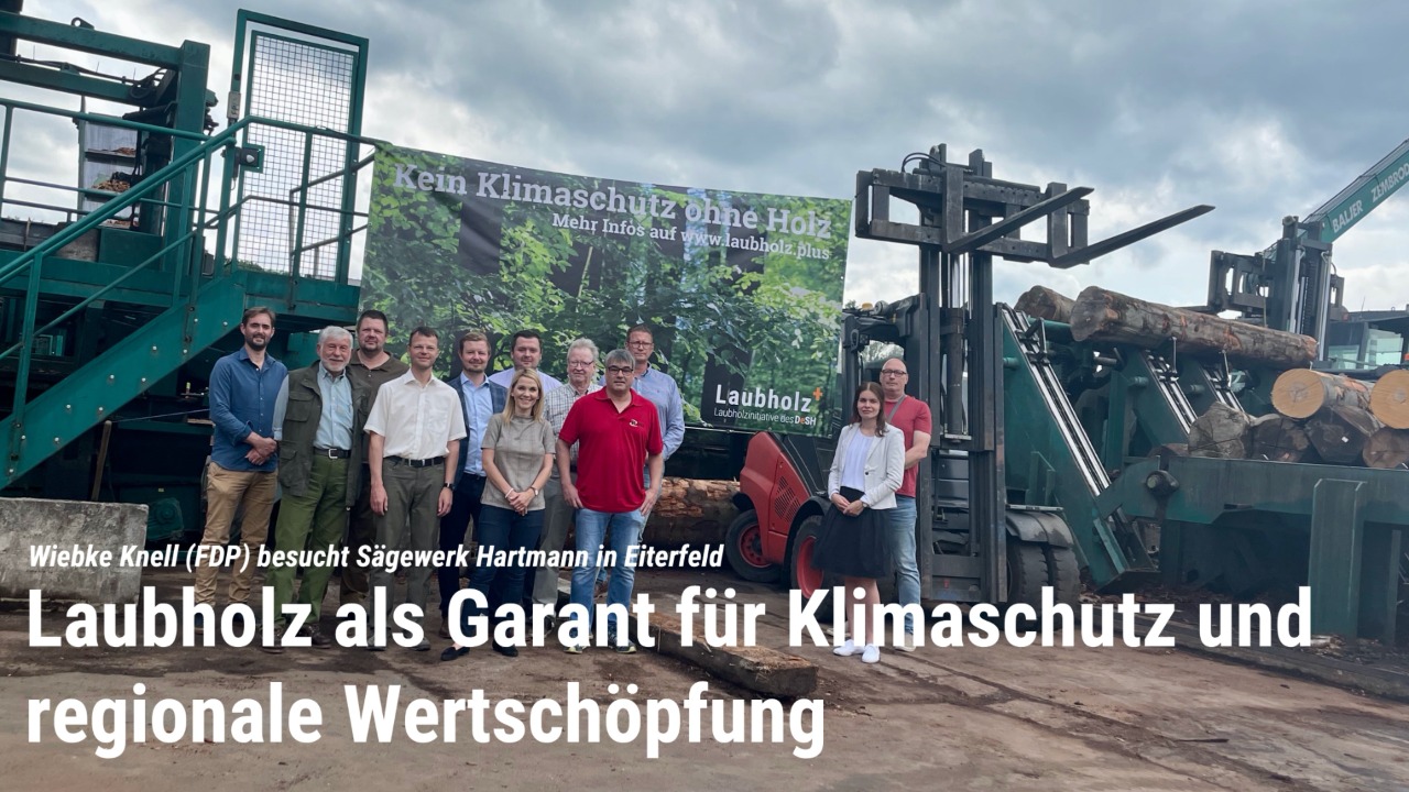 Am 20. Mai 2022 besuchte Wiebke Knell, FDP-Abgeordnete im Hessischen Landtag und Sprecherin für den Ländlichen Raum, Umwelt, Landwirtschaft und Verbraucherschutz das Sägewerk der Hartmann GmbH in Eiterfeld. Bei einer Führung durch den laubholzverarbeitenden Betrieb konnte Geschäftsführer Uwe Hartmann die Politikerin von der ressourcenschonenden Verarbeitung des heimischen Rohstoffs überzeugen und auf akute Probleme aufmerksam machen. Im Anschluss diskutierten die Anwesenden, darunter Julia Möbus, Geschäftsführerin des Deutsche Säge- und Holzindustrie Bundesverbands e.V. (DeSH), über die Zukunft der Holzwirtschaft.
