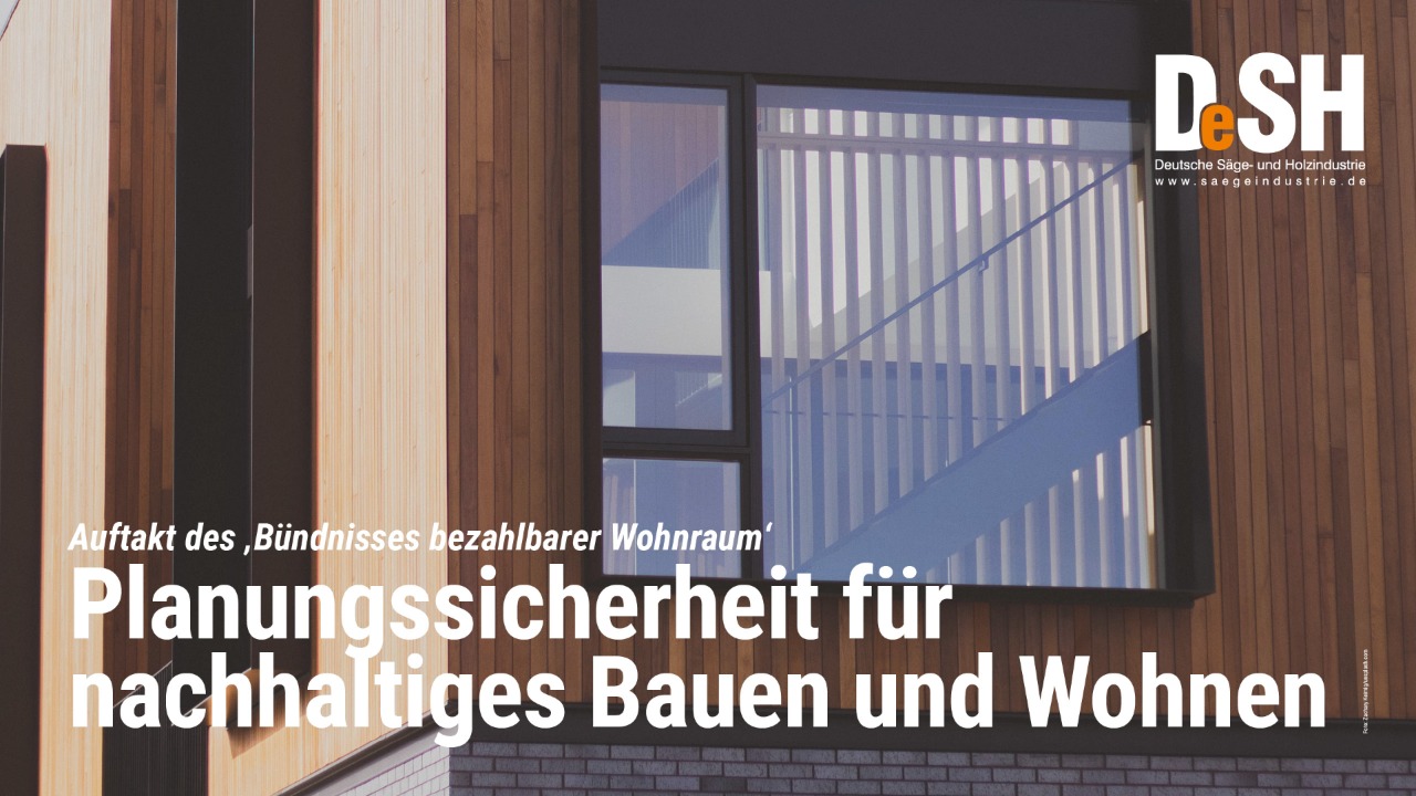 Auf Einladung von Bundesbauministerin Klara Geywitz (SPD) wird heute zum ersten Mal in der neuen Legislaturperiode das ‚Bündnis bezahlbarer Wohnraum‘ in Berlin zusammenkommen. Der Deutsche Säge- und Holzindustrie Bundesverband e.V. (DeSH) begrüßt die Auftaktsitzung und betont vor dem Hintergrund der ambitionierten Ziele der Bundesregierung und derzeitigen Unsicherheiten bei Lieferketten, Förderungen und der weltpolitischen Lage die Bedeutung verlässlicher Rahmenbedingungen auf dem Weg zu nachhaltigem und bezahlbarem Wohnraum für alle.