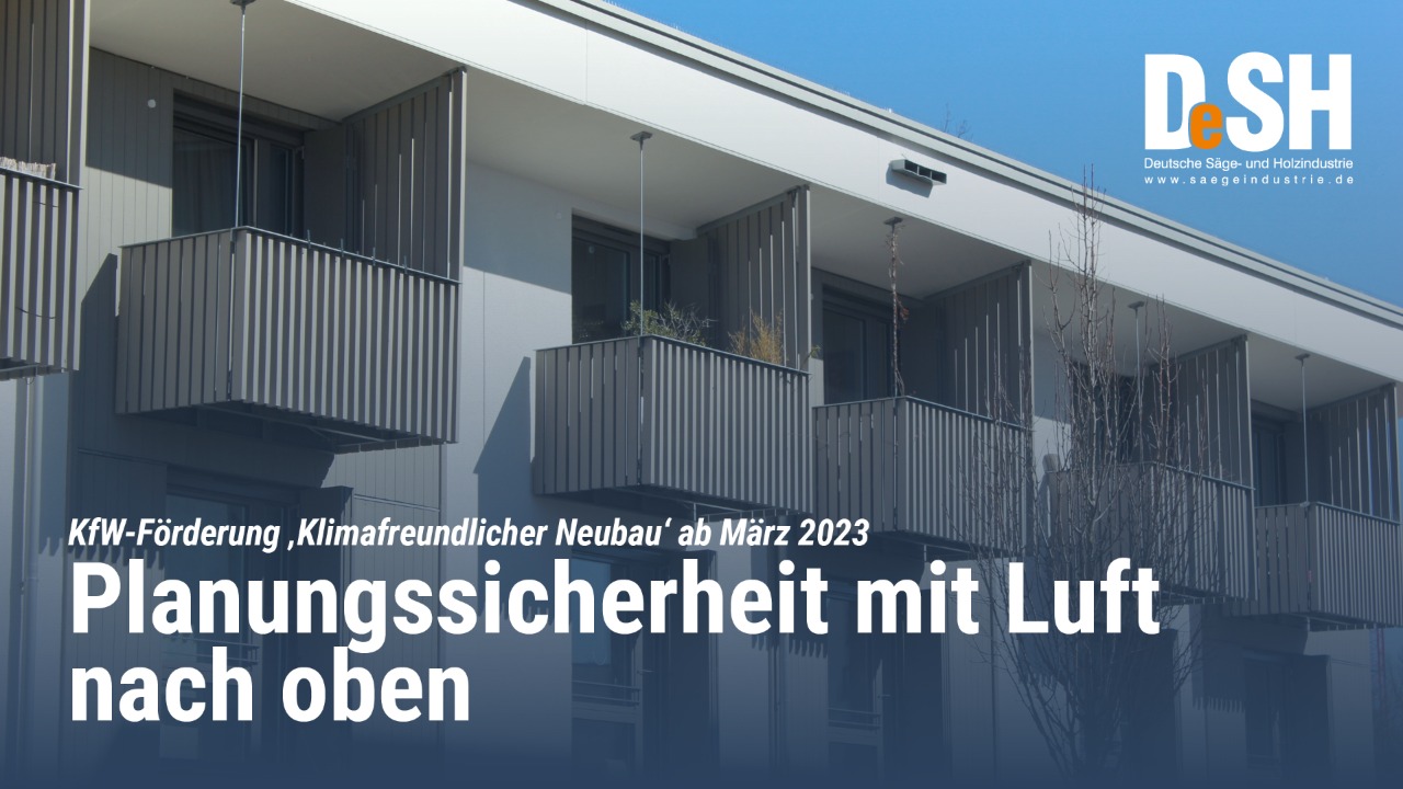 Ab dem 1. März 2023 kann im Rahmen der Bundesförderung für Effiziente Gebäude wieder eine Förderung für den Neubau beantragt werden. Der Deutsche Säge- und Holzindustrie Bundesverband e.V. (DeSH) begrüßt den Schritt als wichtiges Signal für die Planungssicherheit, mahnt jedoch eine Ausweitung des geringen Förderrahmens und die Umsetzbarkeit der angestrebten Nachhaltigkeitszertifizierungen an.