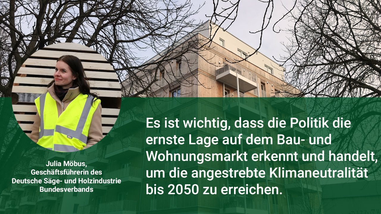 „Es ist wichtig, dass die Politik die ernste Lage auf dem Bau- und Wohnungsmarkt erkennt und handelt, um die angestrebte Klimaneutralität bis 2050 zu erreichen“, mahnt DeSH-Geschäftsführerin Julia Möbus. „Der moderne Holzbau erfüllt höchste Bau-, Umwelt-, Energie- und Nachhaltigkeitsstandards und bietet smarte, schnelle und bezahlbare Lösungen für nahezu alle Einsatzzwecke. Daher sollten wie in anderen Bereichen der Politik entschlossen und finanziell umfassend die Weichen für die Zukunft gestellt werden“, sagt Möbus.