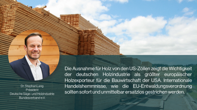 In der aktuellen Diskussion zum US-Zollpaket hat Dr. Stephan Lang, Präsident Deutsche Säge- und Holzindustrie Bundesverband (DeSH), ein kurzes Statement abgegeben.